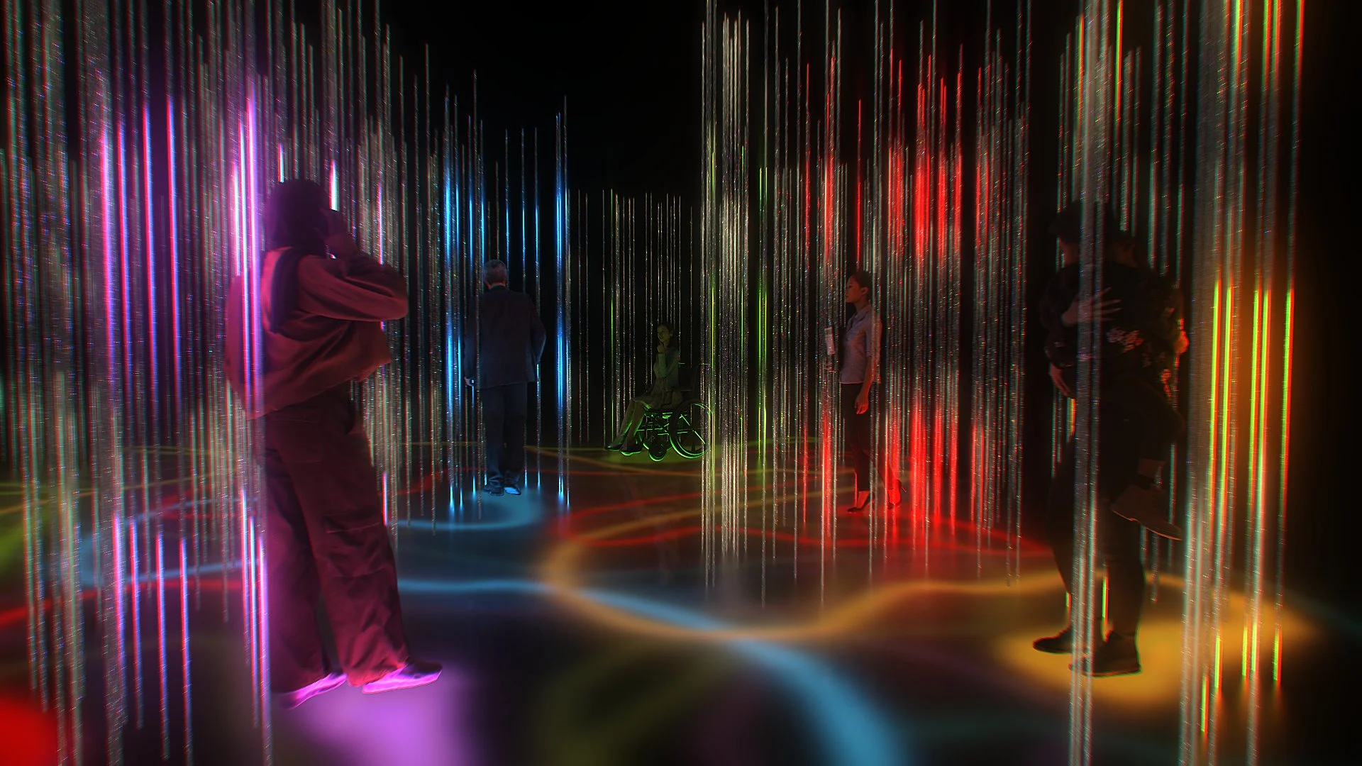 A field of vertical light columns responds in real time, pulsing with each participant as they move through the space
